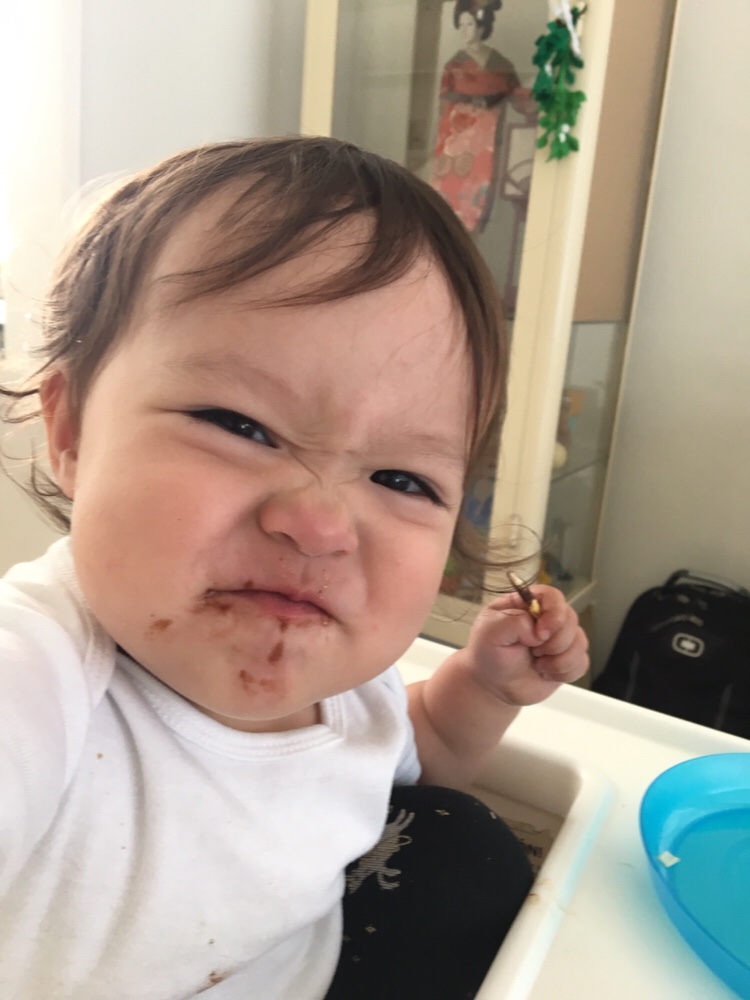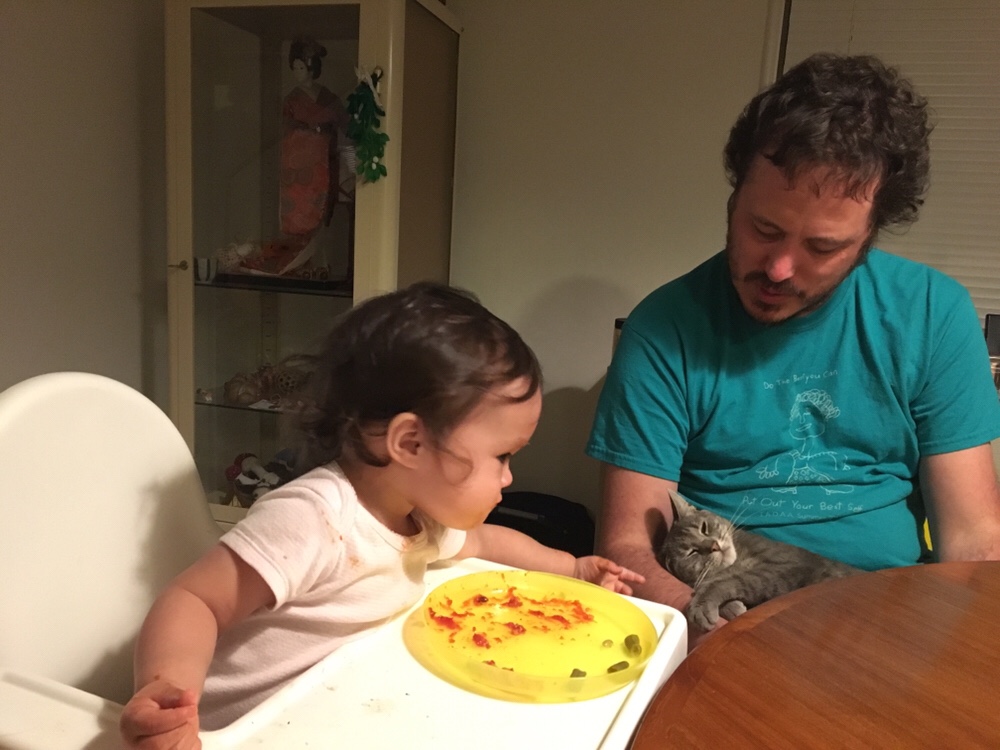 Anna gets to pet a cuddly Cindy at dinner. Cindy gets marinara sauce on her head.