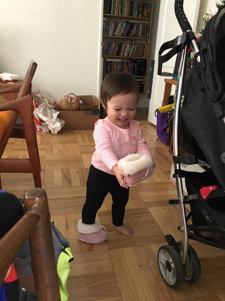 Anna finally gets to wear her moccasins from Barbara but she would rather feel how soft they are.