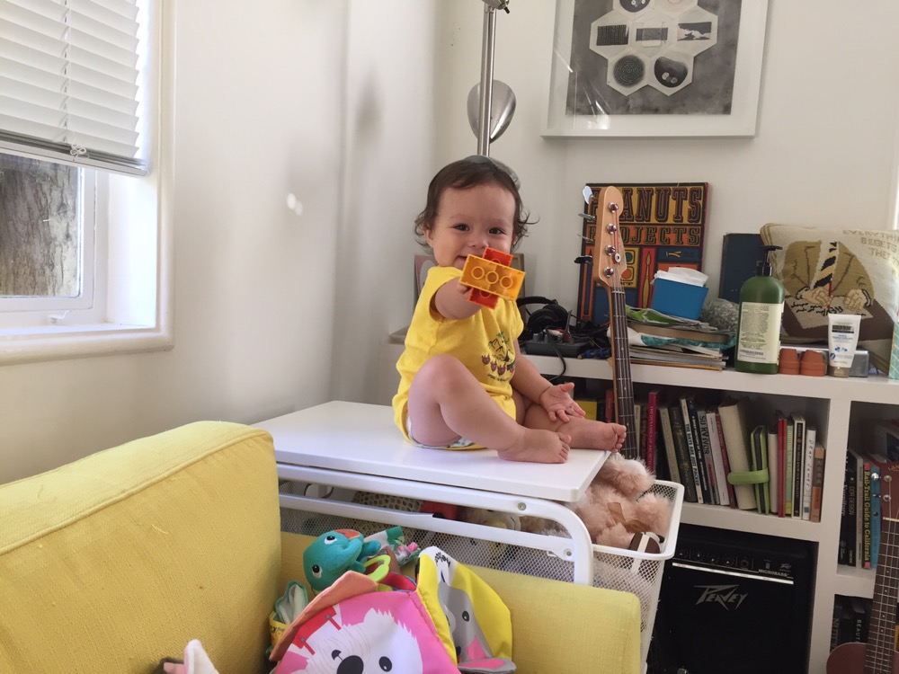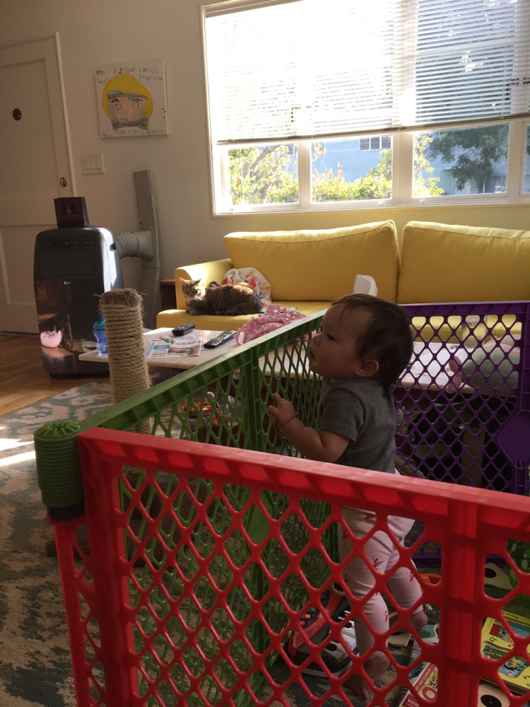 Anna watches “Trolls” from baby jail while Bon enjoys some care free sunning.
