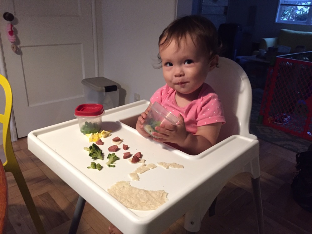 Anna loves her new ball so much she has to maneuver around it for breakfast.