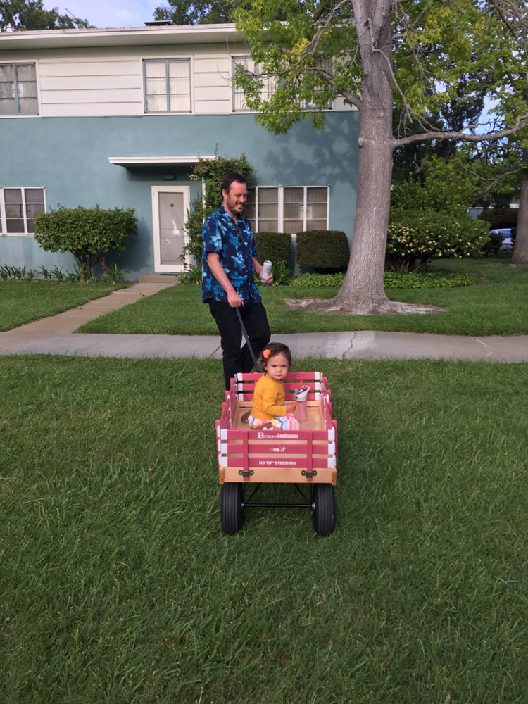Anna borrows her friends wagon for a ride.