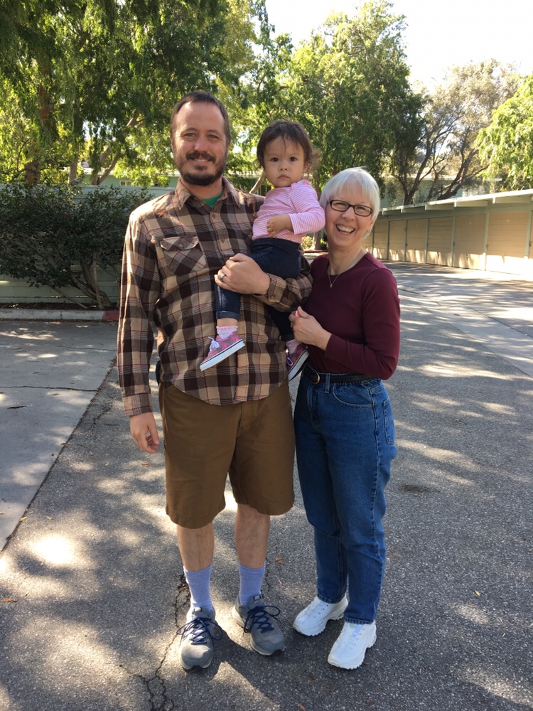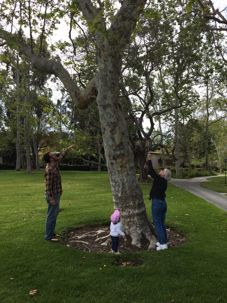 Grammy and Daddy get a tree branch free while Anna supervises.